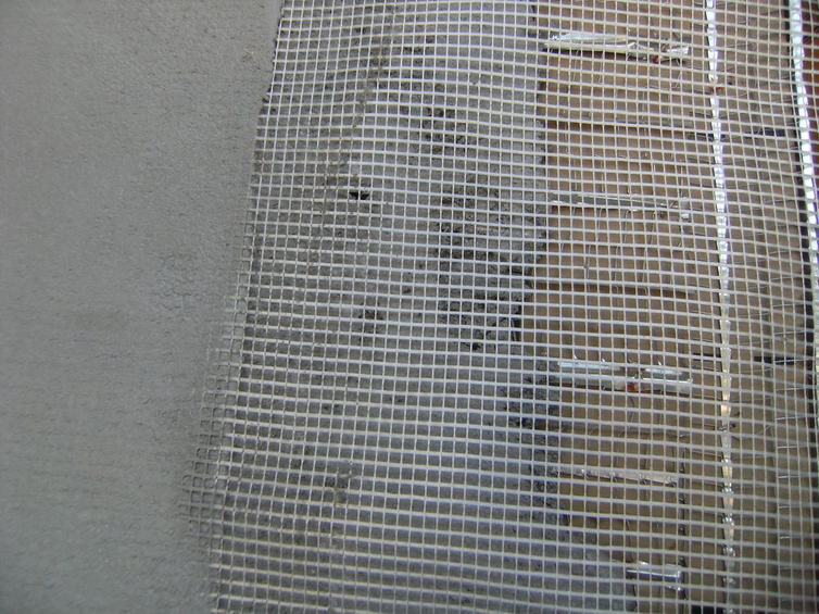 下地のモルタル自体(写真)に張ってあるメッシュも一役買っていて、まず下地からヒビが起きにくいようにし、素材でも起きにくいようにする。