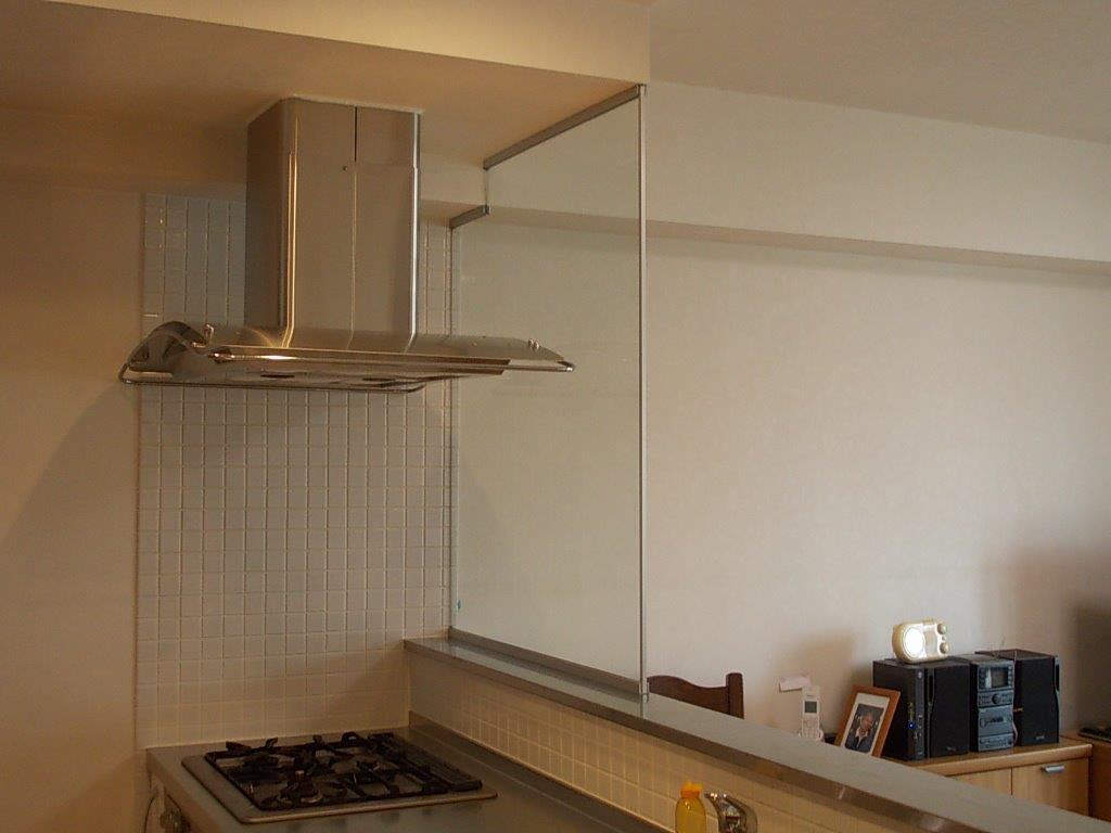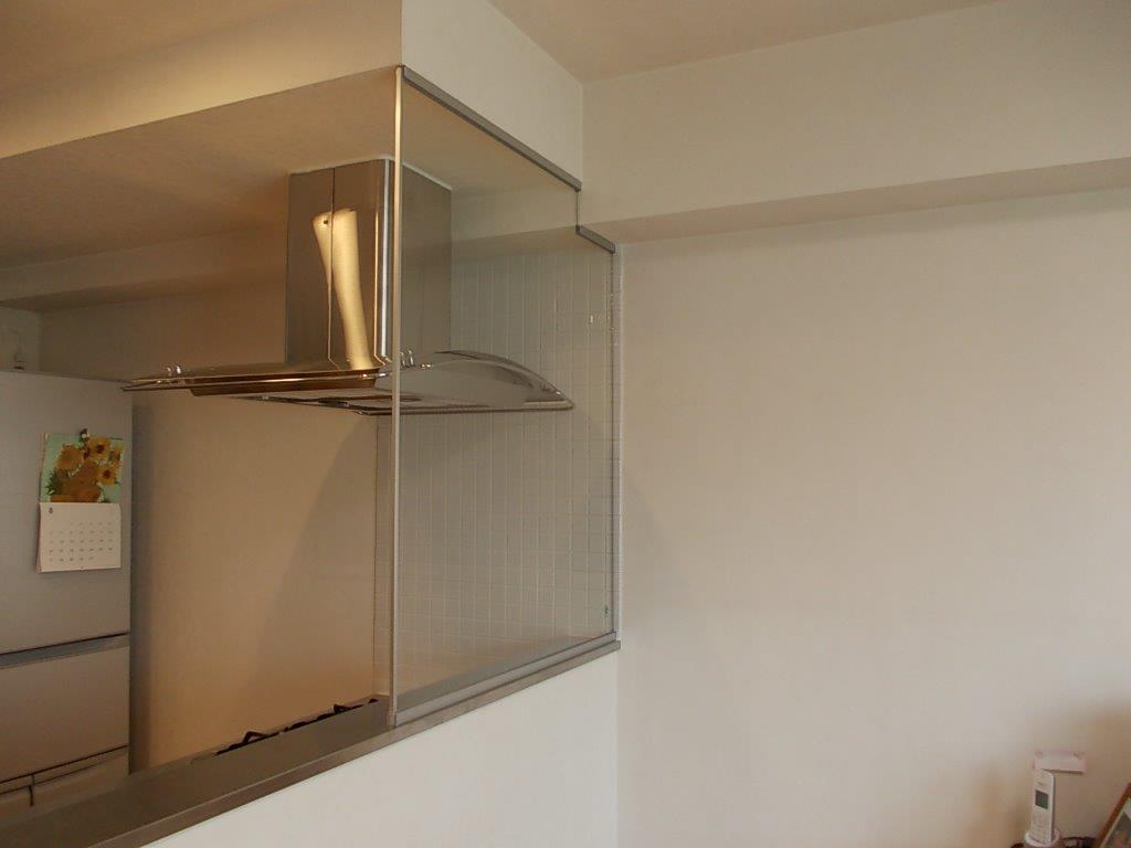 通常多くは、コンロ廻りは消防法上不燃材の壁ですが、ガラスも認められています。